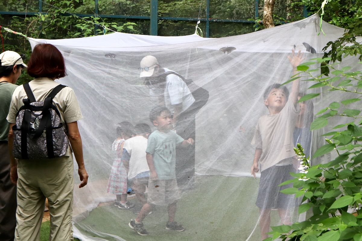 虫といっしょに人も入ります。中に入ると世界が変わりますよ。虫はスタッフもつかまえますが、みんなもつかまえて入れてください。
