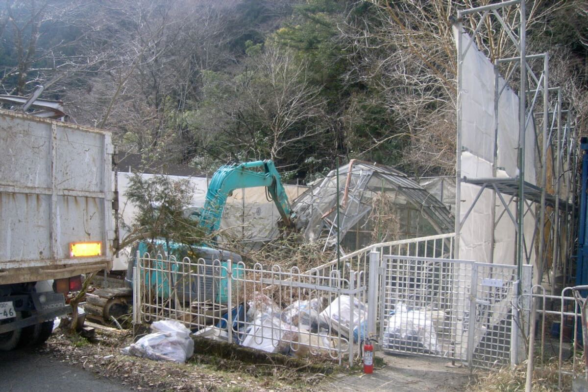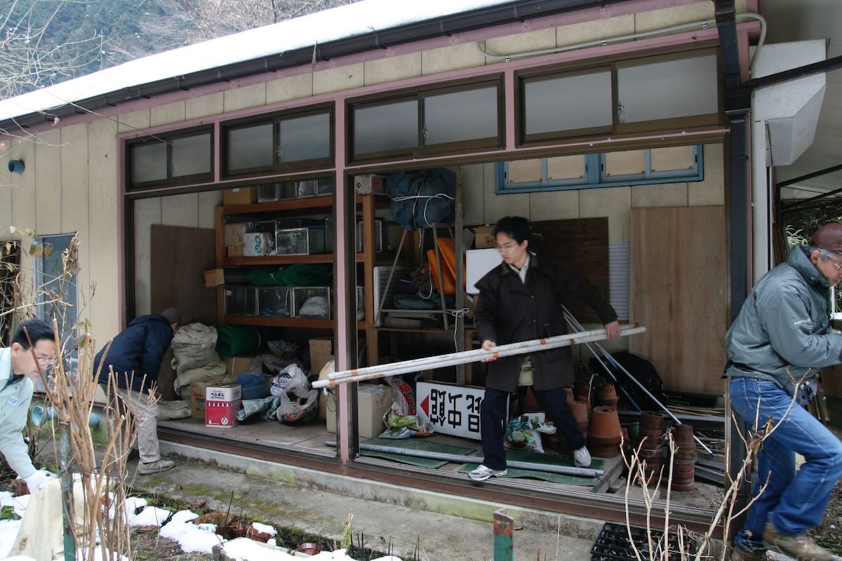 むしの会会員による施設整備作業。この倉庫は水害後撤去されてオープンスペースとなりました。