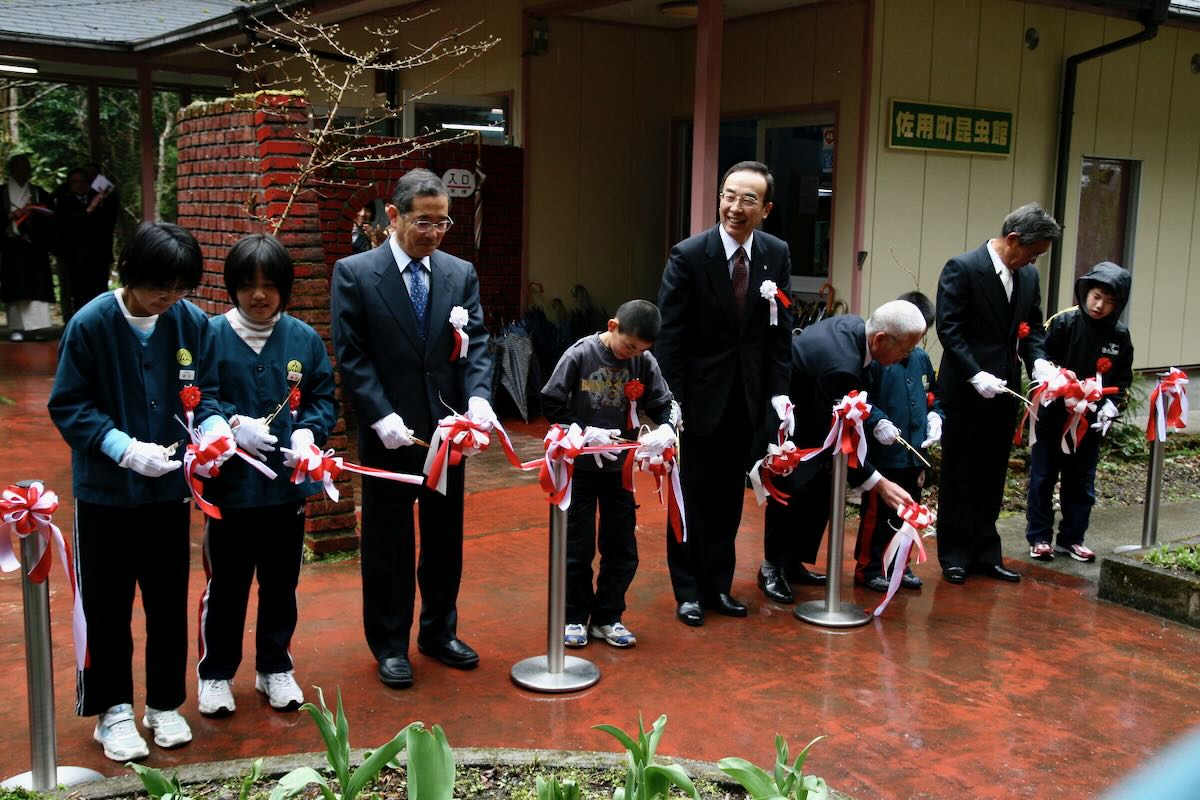 新しく生まれ変わった昆虫館が開館し、翌4月4日(日)小雨の降る中、開館記念式典が行われました。 テープカットだけを玄関前で、あいさつや祝辞は広くなった館内で行われました。当日のようすはこちら。