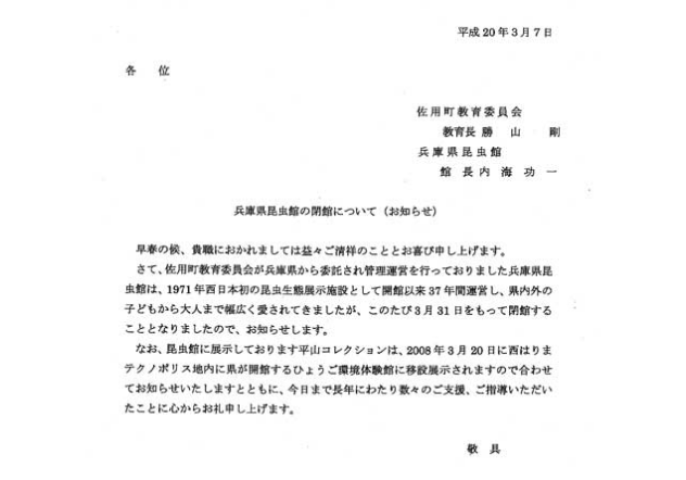 兵庫県昆虫館、閉館の通知(2008.3.7付)