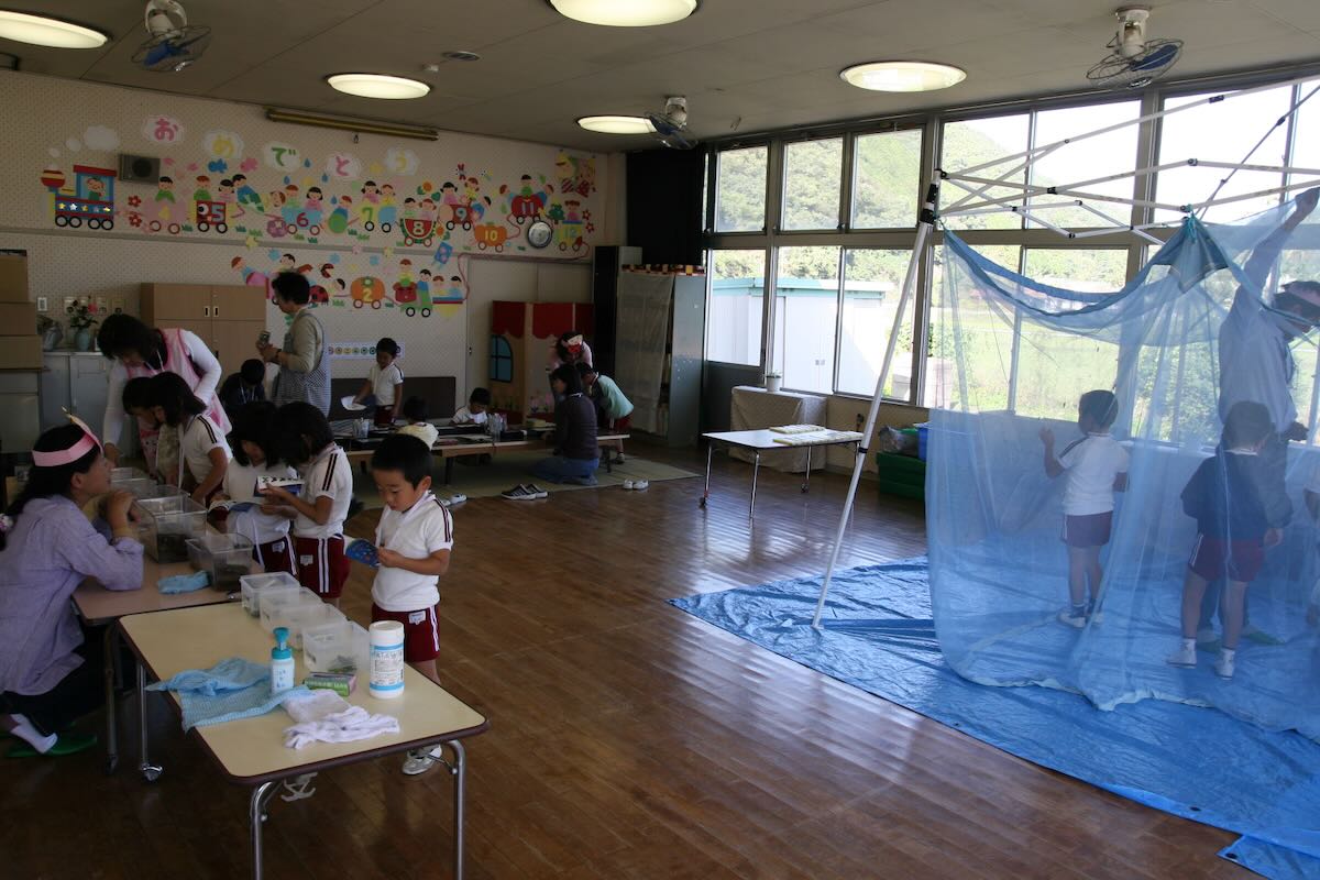水害で休館中の昆虫館スタッフは、佐用の子どもたちを楽しませようと、虫や標本を持って町内の幼稚園・保育園を訪問しました。 これがはじめての「いどうこんちゅうかん」でした。