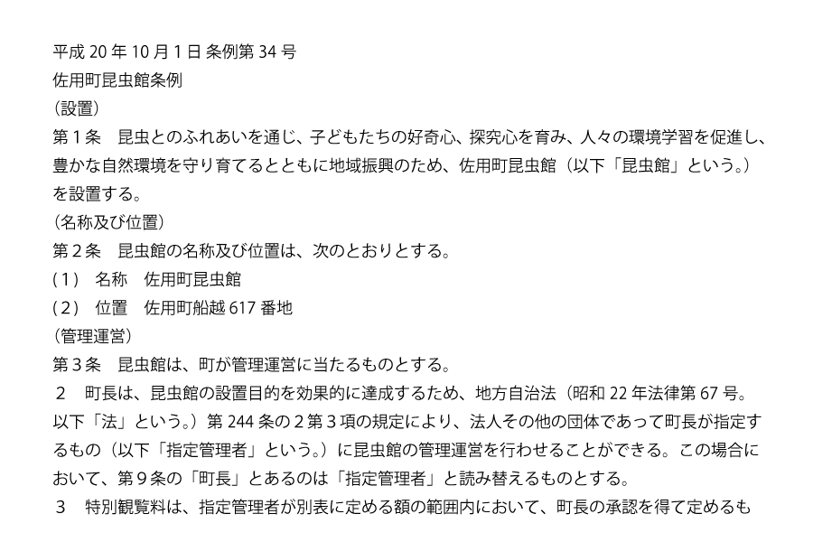 昆虫館の施設が、兵庫県から佐用町へ無償譲渡され、佐用町昆虫館条例が公布・施行されました。