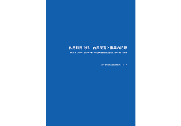 人と自然の博物館との連携協定調印が行われた直後のことでした。8月9日の夜から10日未明にかけて発生した台風9号の水害によって、佐用町昆虫館も大きな被害を受け、昆虫館は、開館から4ヶ月で再び休館となりました。 しかし、全国からの温かいご支援、関係者の献身的な努力により、2010年4月、再び開館することができました。その経過は、のちに「佐用町昆虫館、台風災害と復興の記録~平成21年(2009年)台風9号水害による佐用町昆虫館の被災と復旧、復興に関する記録集~」としてまとめられました。 A4判32ページ(半分カラー)の冊子です。