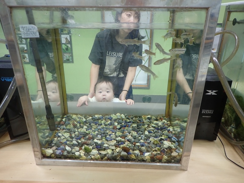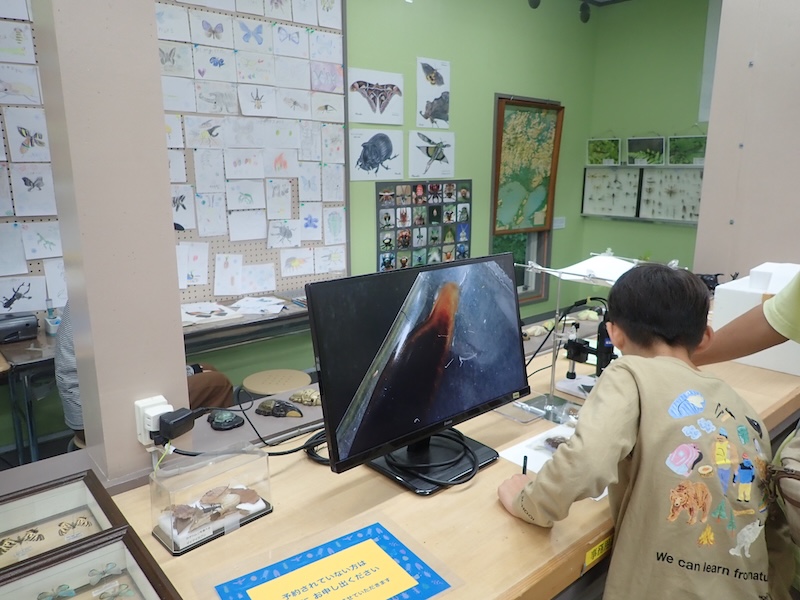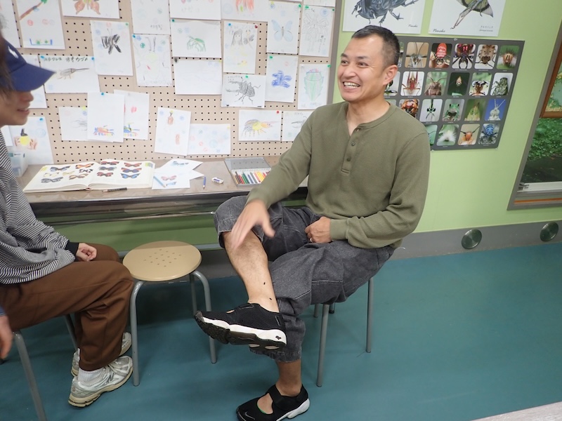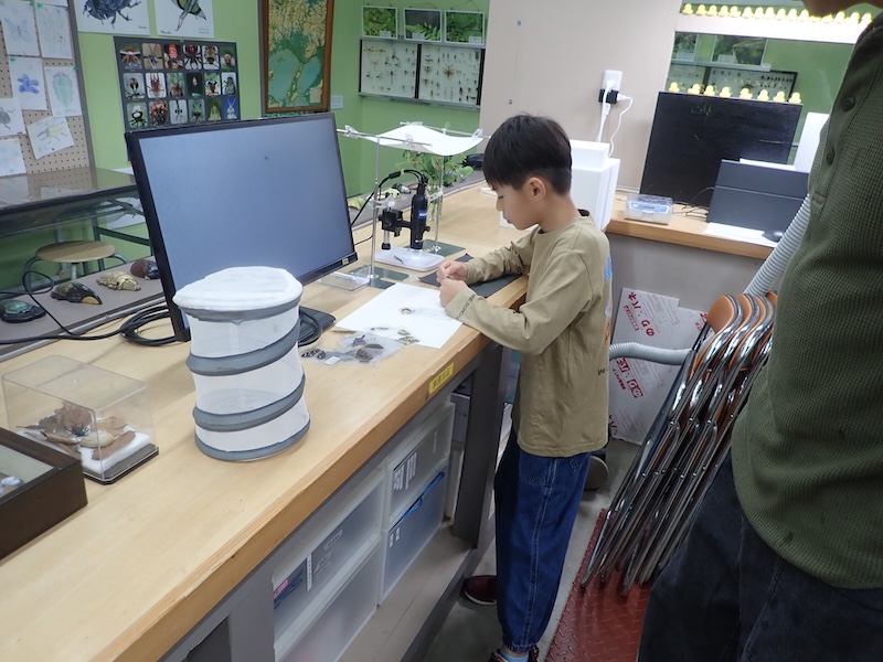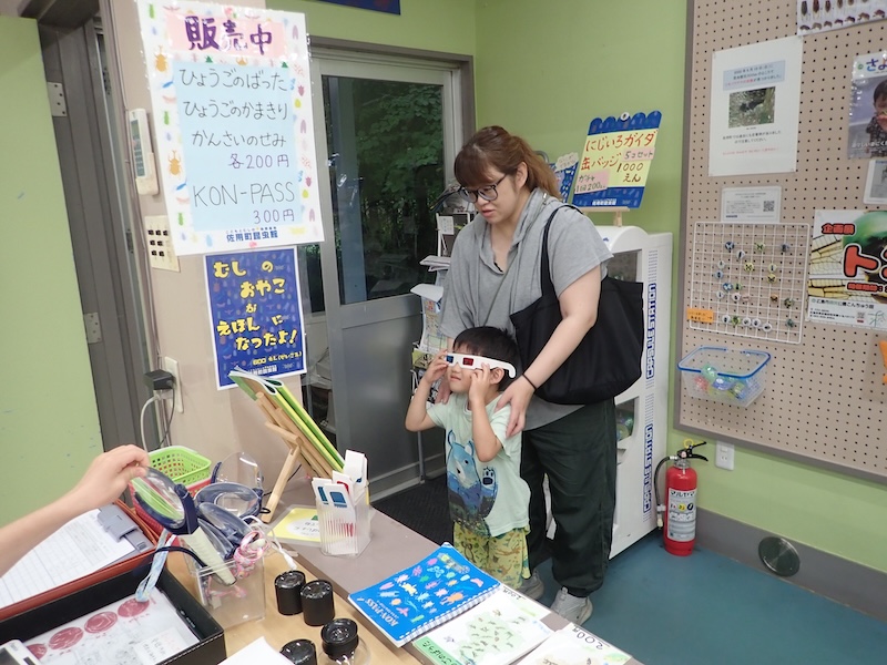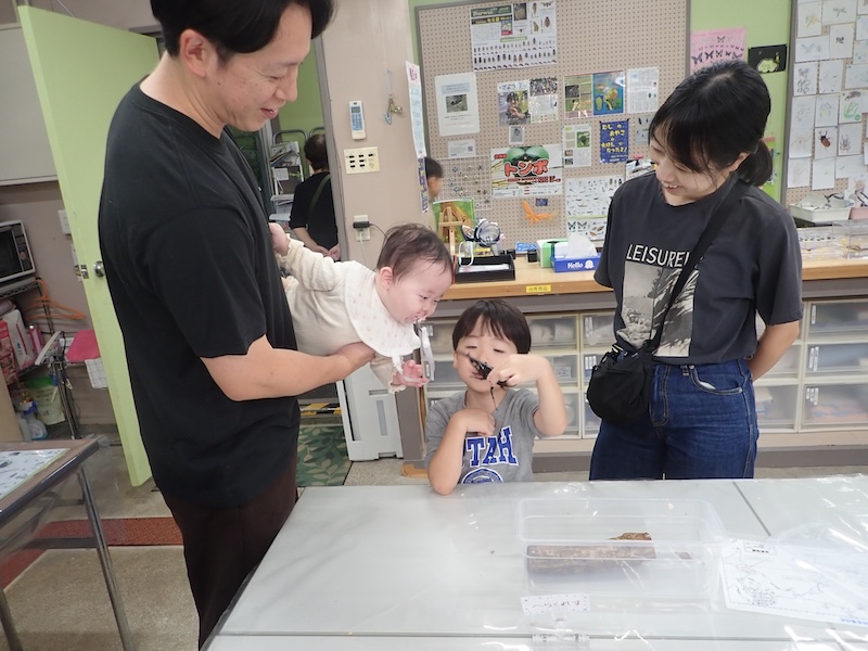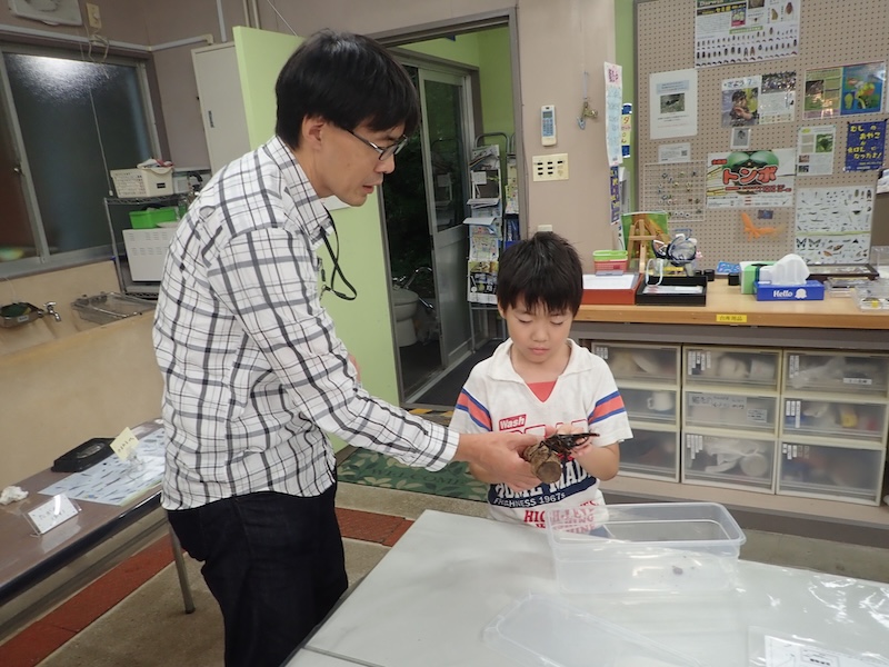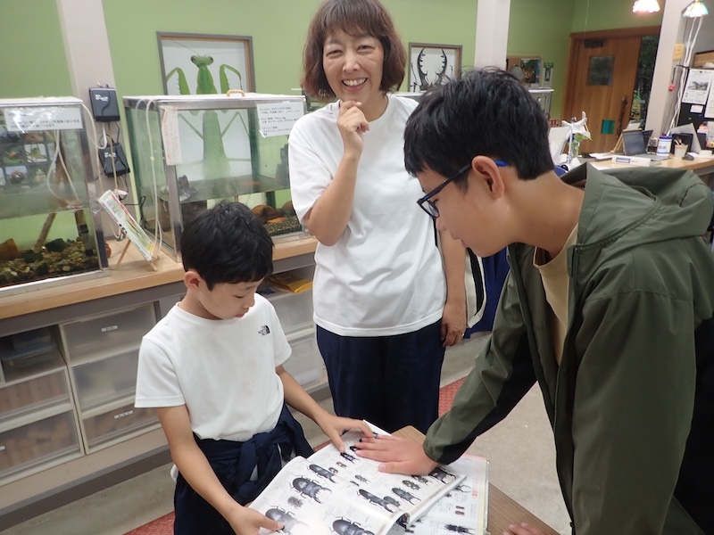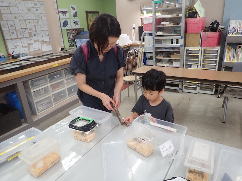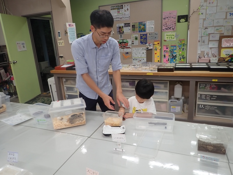 最後に来られた来館者南光自然観察村に泊まるということで、明日も来館されるとのことです。閉館準備を手伝ってもらいました。生き虫を展示ケースから餌のあるケースに移してもらいました。