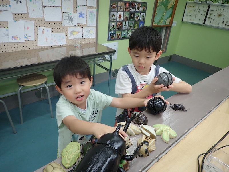 今日は野外で採集できない分、館内で資料を見たり、生きムシに飽きたらフィギアで遊んだりといろいろ工夫しながら結構長い時間皆さん館内で過ごしておられました。