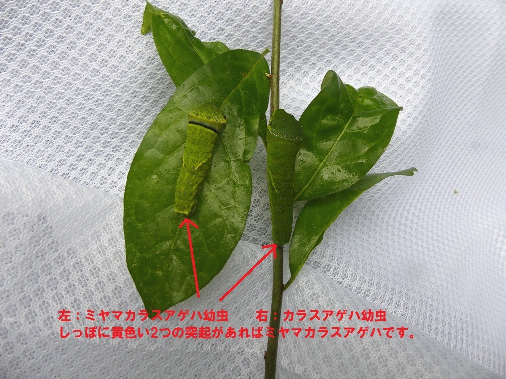 ミヤマカラスアゲハ幼虫には2つの突起がありますが、カラスアゲハ幼虫にはありません。カラスザンショウからはどちらもサナギになるため降りてくる時期です。時々サンショウにもカラスアゲハ幼虫が見つかるので、ぜひ探してみて下さい。