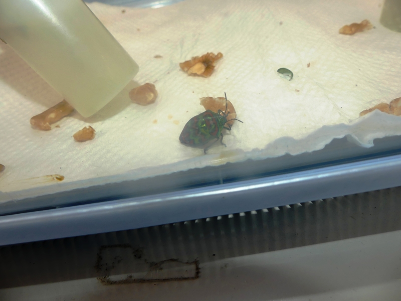 にじいろガイダ(ニシキキンカメムシ)、最終日まで第2化成虫、元気にいてくれました。今後、終齢幼虫と共に越冬モードに入ります。
