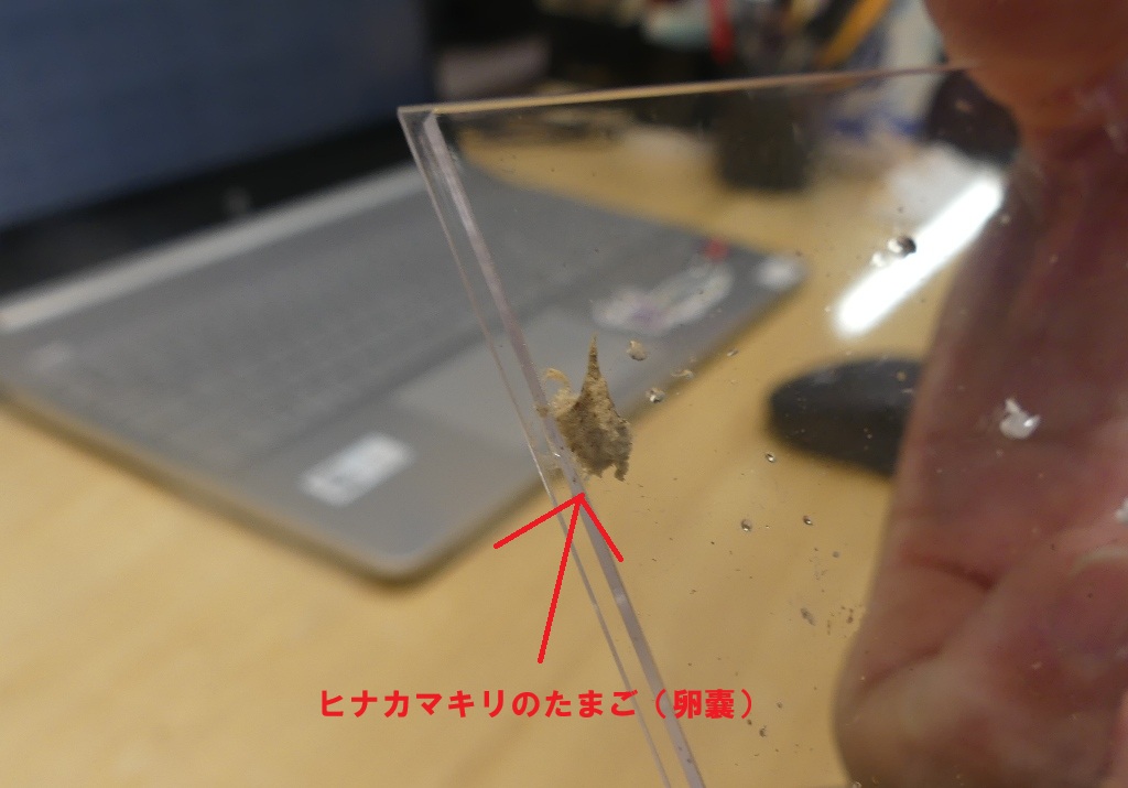 今日のトピックは、採集して展示していたヒナカマキリの飼育ケースのふた内側の何やら異物が・・・。