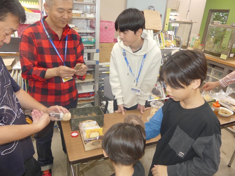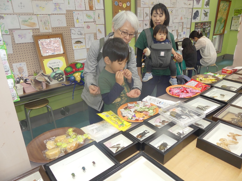 久保さんはお菓子、植物の苗木、展翅版など無料配布の大サービス!