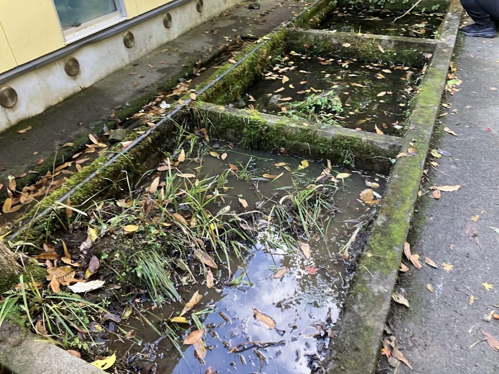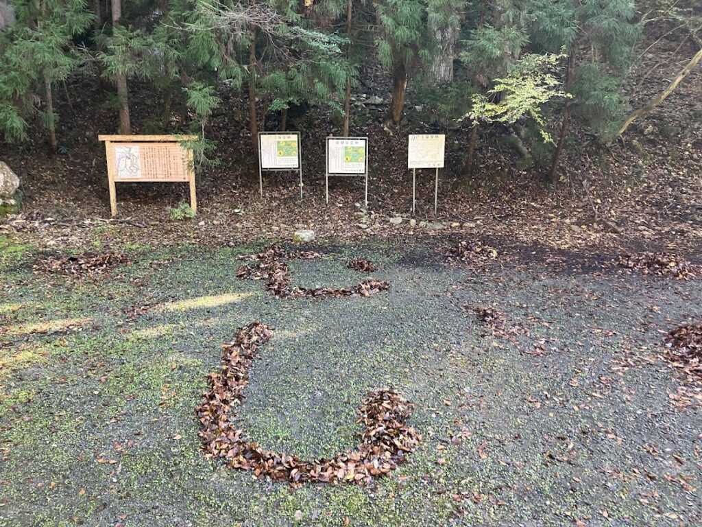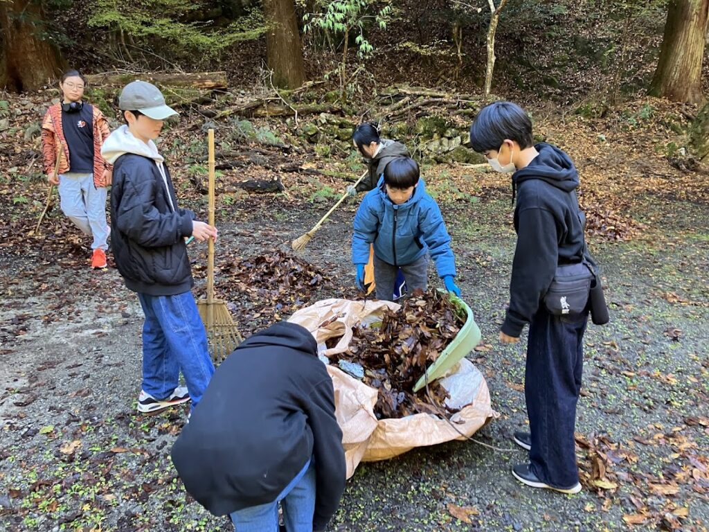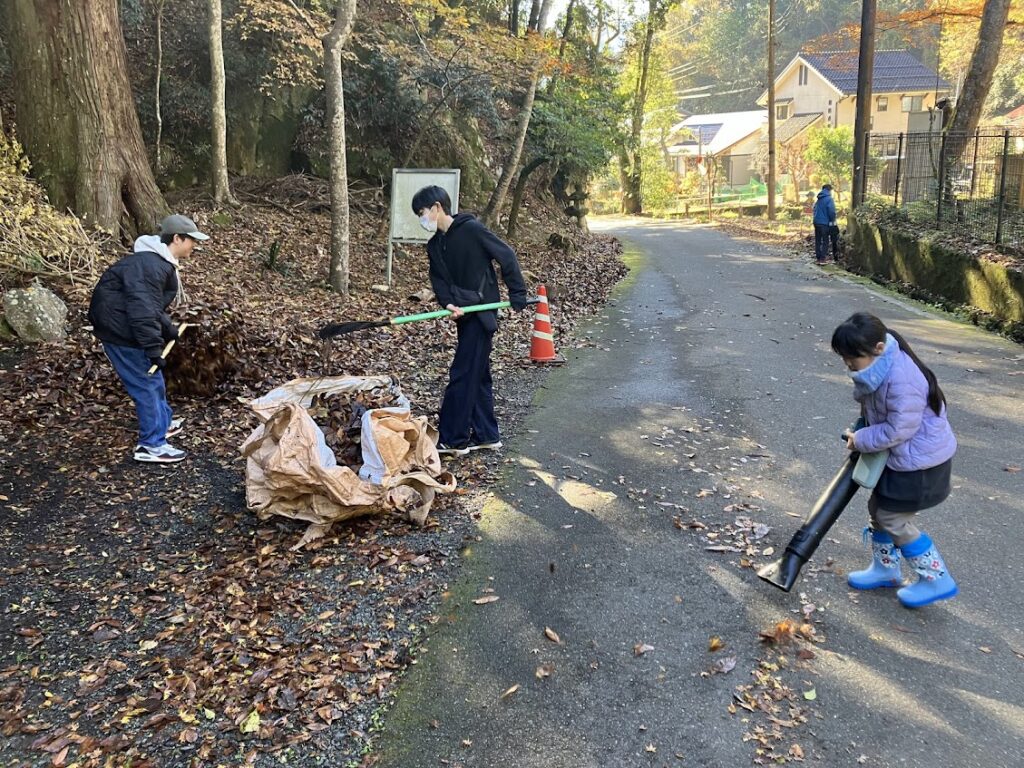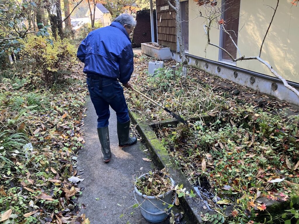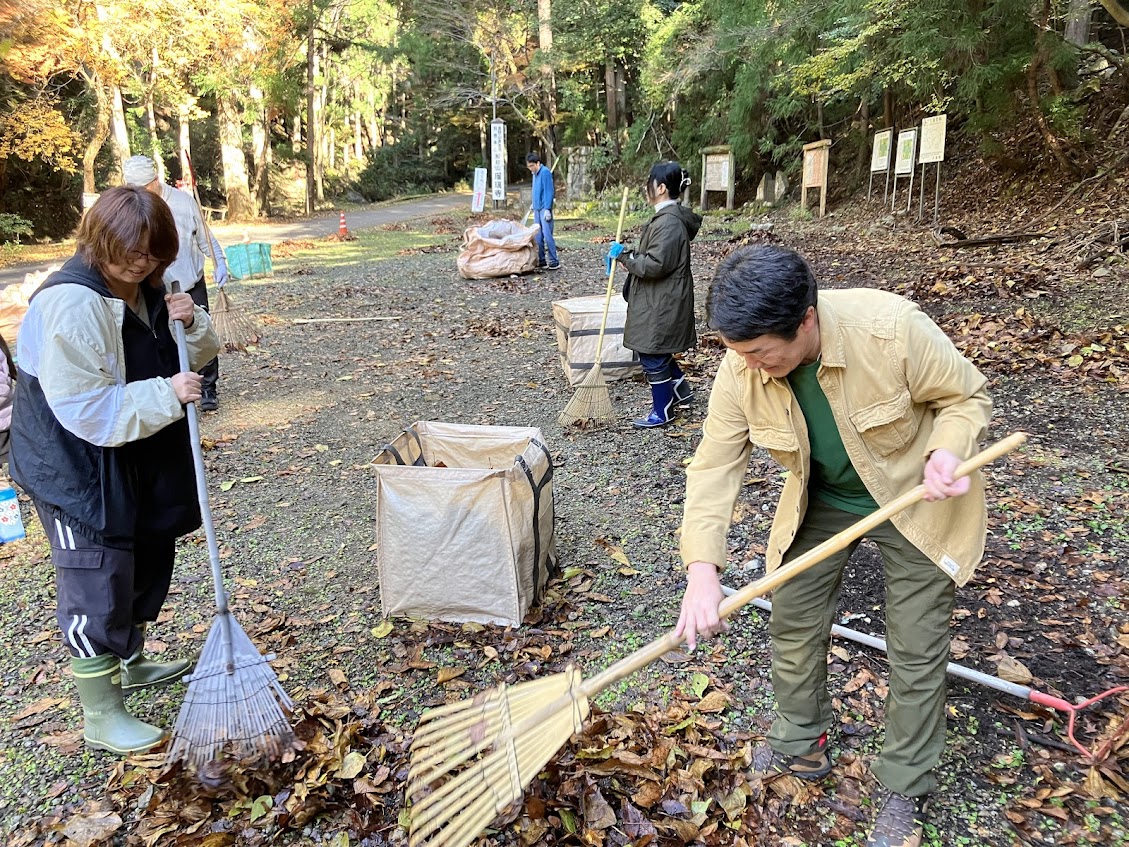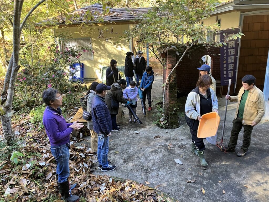 スタッフが集まり、昆虫館周辺の大掃除をやります。まずは駐車場の落ち葉を集めて大袋に入れます。