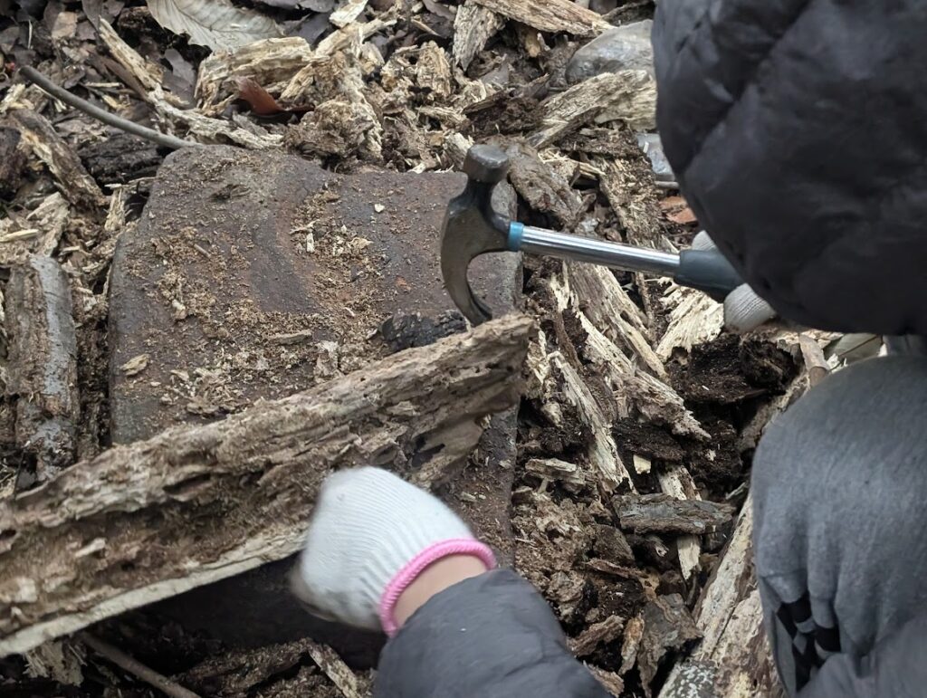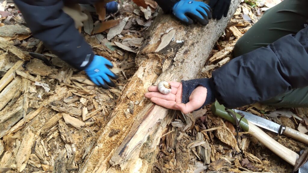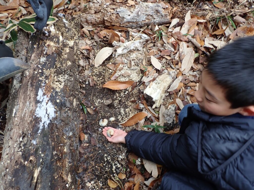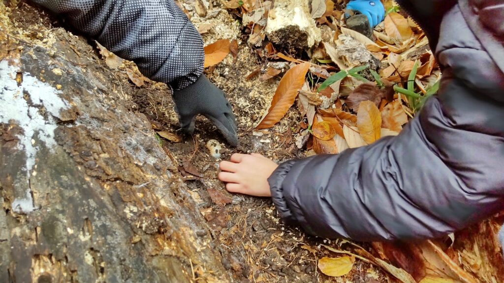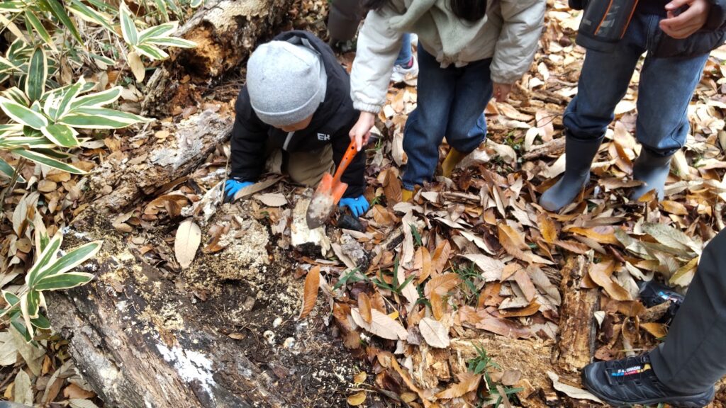 レクチャーの後はむし採りタイムです。みんな思い思いの場所で朽ち木の中や土の中を探します。