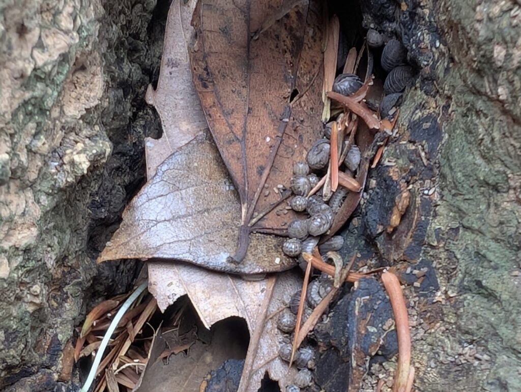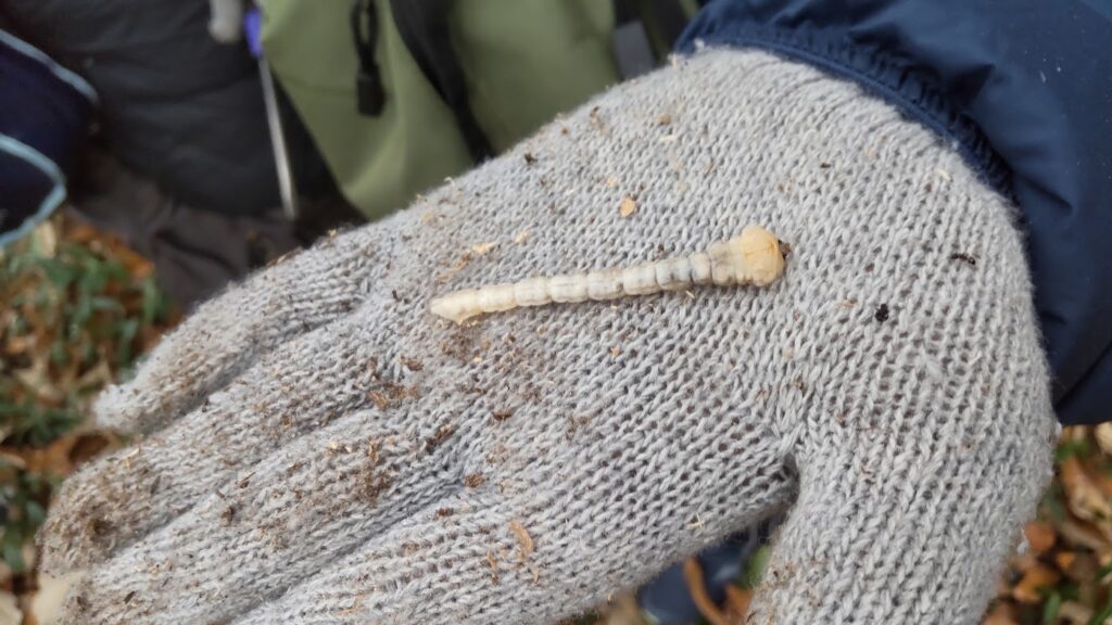 まず最初に冬のむしの探し方についてレクチャーしています。特に朽ち木にいるむしはどんな木が好きかについてみんなで考えました。乾いた木、湿った木、太くて大きい木、細くて小さい木など林内にはいろんな朽ち木が落ちています。
