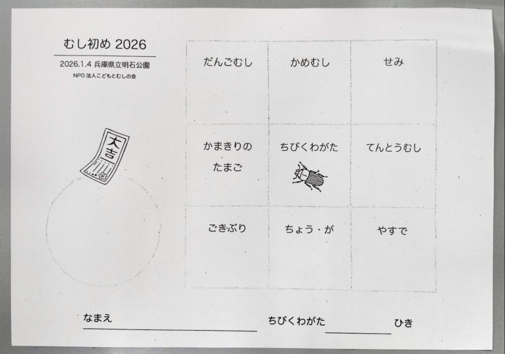 2026年1月4日、お正月休み最後の日に毎年恒例になっている「むし初め」を開催しました。新年一発目のむしイベントです。開催地はチビクワガタの聖地である明石公園。みんなの今年の「初むし」は何になるでしょうか。