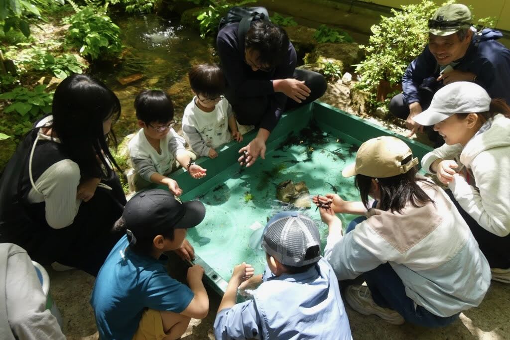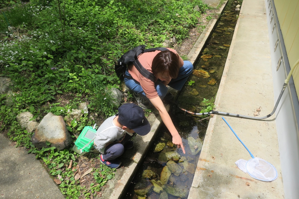 イモリやオタマジャクシ、ヤゴなどがいます。アミは使わず手でつかまえてね。